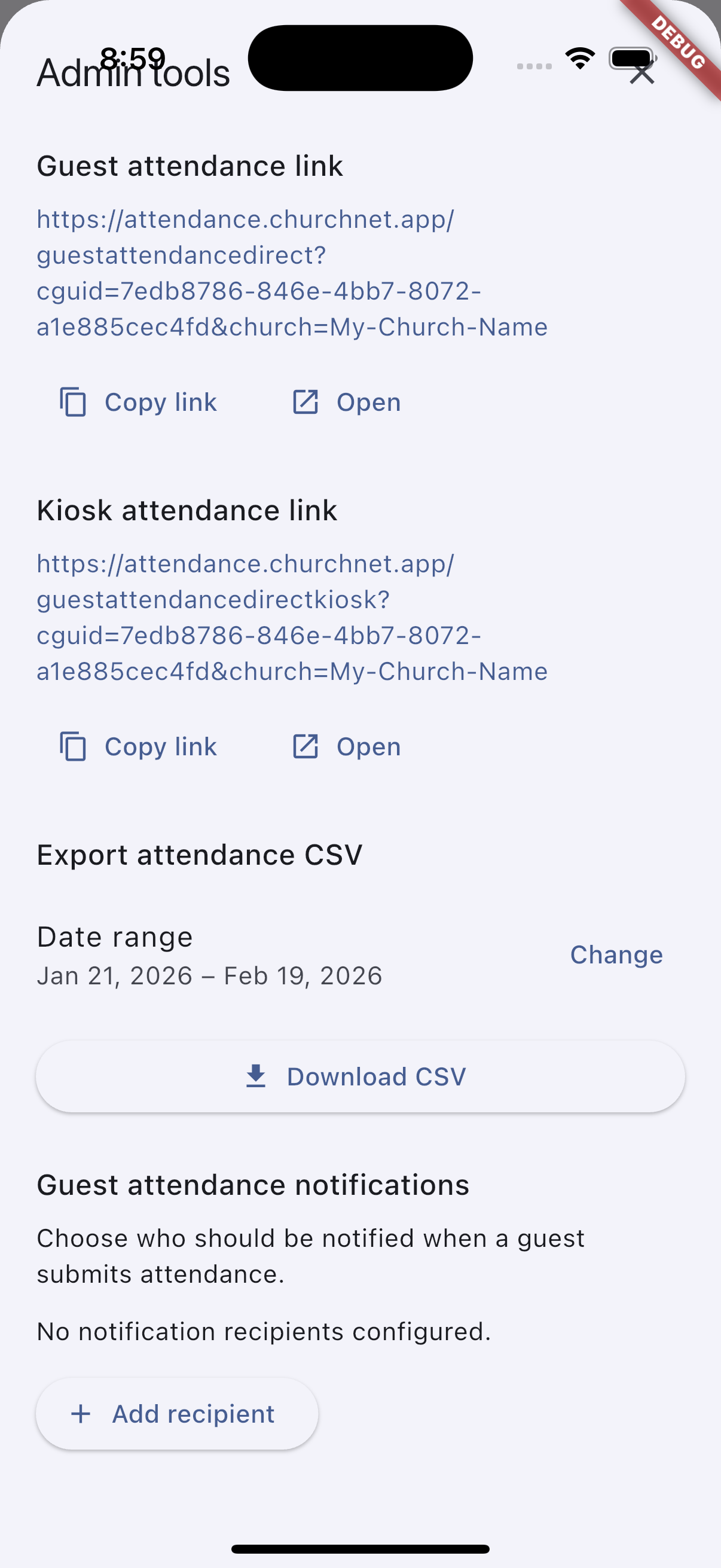 Administrators can export attendance records from the Attendance module as a CSV file for reporting or record-keeping.